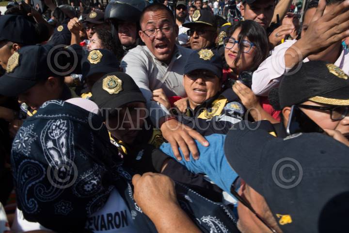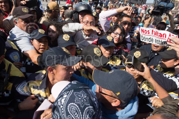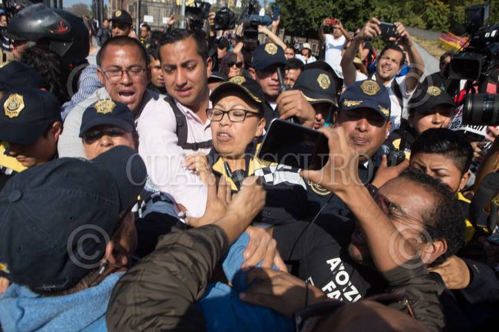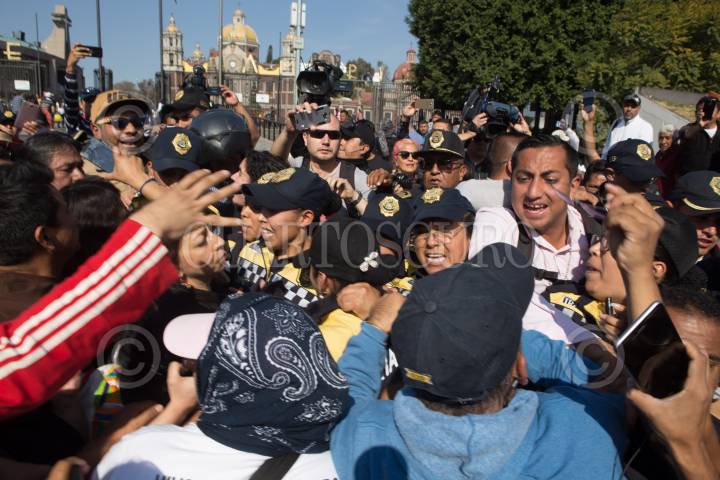 CIUDAD DE MÉXICO, 26DICIEMBRE2017.- Policías y familiares de los 43 normalistas desaparecidos de Ayotzinapa, se dieron de jaloneos al concluir la marcha en la Basilica, debido a que los oficiales de tránsito les bloquearon el acceso a la Iglesia. FOTO: TERCERO DÍAZ /CUARTOSCURO.COM