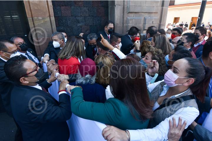 Integrantes de la LXI Legislatura local, familiares y amigos arribaron a la Cámara de Diputados del Estado de México a tomar protesta, con acceso restringido, algunos empujones, medidas higiénicas se dio este cambio de legisladores.