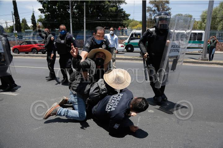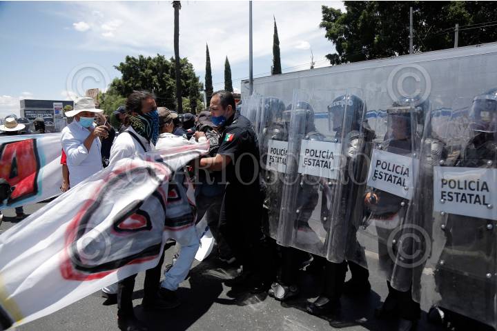 Enfrentamiento entre grupo antimotines y manifestantes quienes protestaban en las instalaciones de la comisión estatal del agua de Queretaro en contra de la ley que regula los servicios de agua potable del estado.