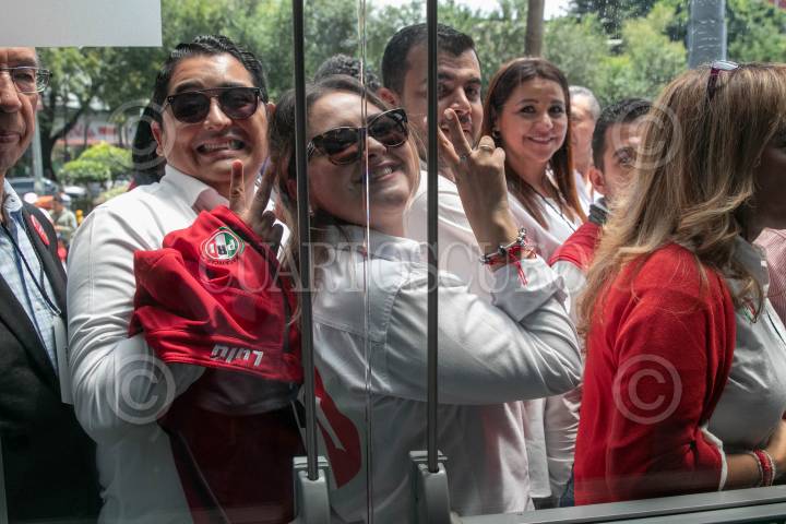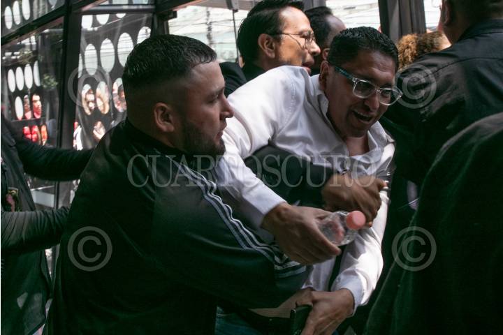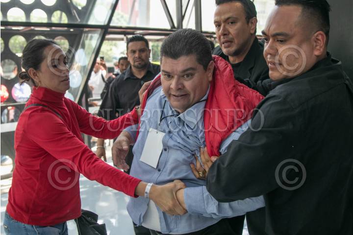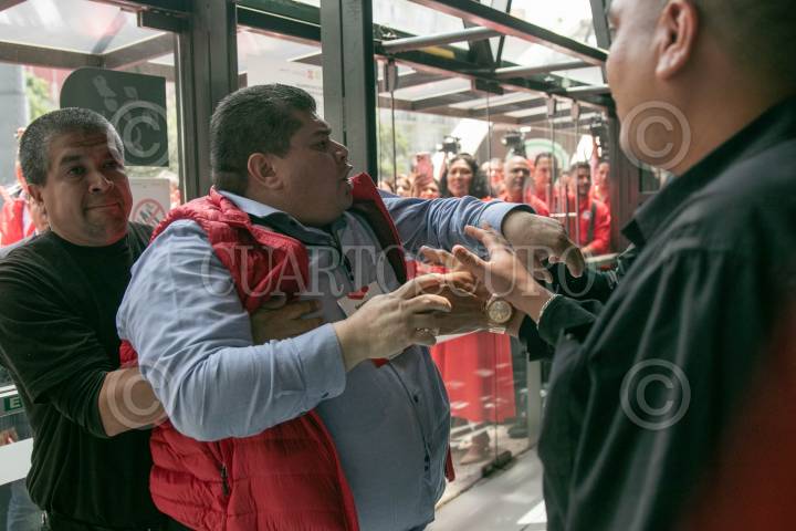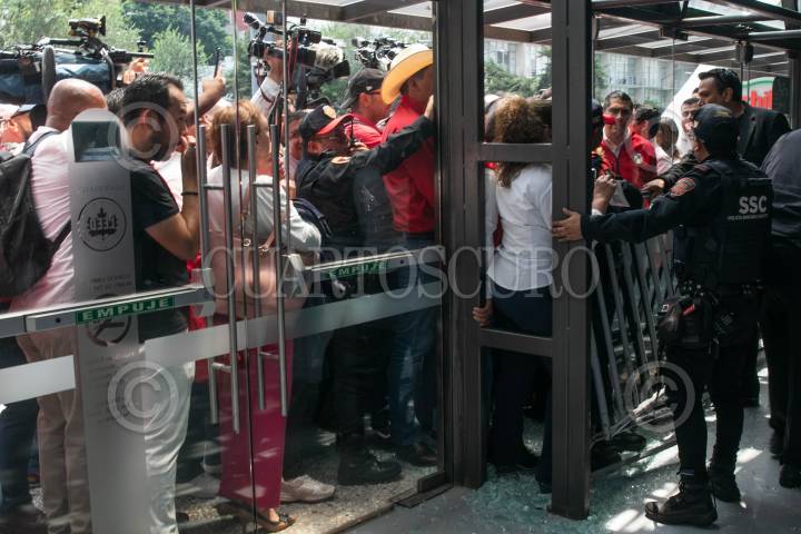 CIUDAD DE MÉXICO, 07JULIO2024.- Militantes del PRI dieron portazo en el Pepsi Center luego de que no les permitieran entrar a la 24 Asamblea Nacional Ordinaria del tricolor, en la cual se modificaron los estatutos para que actual dirigente, Alejandro Moreno Cárdenas, se pueda reelegir hasta tres veces consecutivas y también tenga un mayor control en las bancadas de su partido en el Senado y La Cámara de Diputados. Personal de seguridad argumento que ya no se les permitió pasar por que ya había sobrecupo en lugar y era una medida de Protección Civil, sin embargo, los militantes al ver que ya había iniciado la sesión rompieron un vidrio e intentaron entrar a empujones, lo que provocó la movilización de personal de seguridad del lugar, al final se les permitió el acceso. FOTO: MOISÉS PABLO/CUARTOSCURO.COM