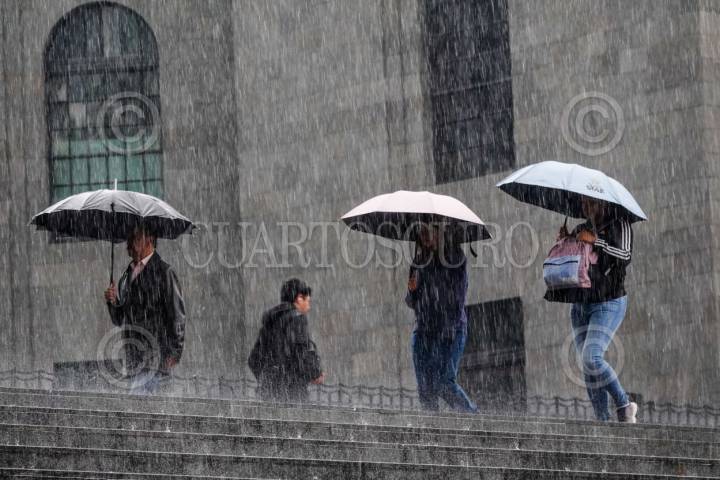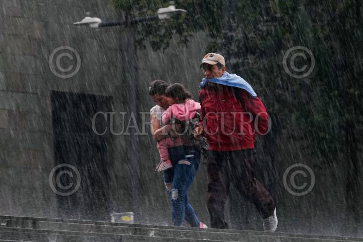 CIUDAD DE MÉXICO, 17JUNIO2025.- Un hombre y una mujer con su hija en brazos corren para buscar refugio tras la presencia de fuertes lluvias en la zona de Reforma. FOTO: GALO CAÑAS/CUARTOSCURO.COM