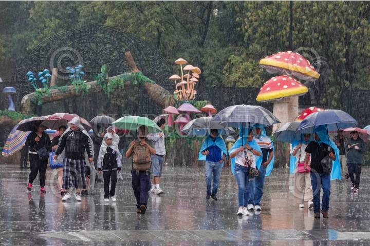 CIUDAD DE MÉXICO, 17JUNIO2025.- Personas que portan sus paraguas se unen al fondo alusivo a hongos de la exposición Spora en el Bosque de Chapultepec, durante la fuerte lluvia que se registró en la zona de Reforma. FOTO: GALO CAÑAS/CUARTOSCURO.COM