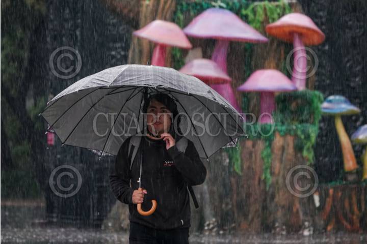 CIUDAD DE MÉXICO, 17JUNIO2025.- Un joven porta su paraguas mientras al fondo se observan los hongos de la exposición Spora en el Bosque de Chapultepec, durante la fuerte lluvia que se registró en la zona de Reforma. FOTO: GALO CAÑAS/CUARTOSCURO.COM