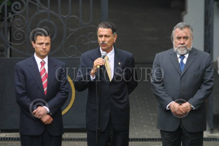 MEXICO D.F. 21SEPTIEMBRE2005.- Enrique Peña Nieto, Gobernador de Estado de Mexico, Carlos Abascal Secretario de Gobernacion y Alejandro Encinas Jefe del Gobierno Distrito Federal. durante la conferencia ofrecieron en la Secretaria de Gobernacion. FOTO: Fernando Garcia/CUARTOSCURO.COM