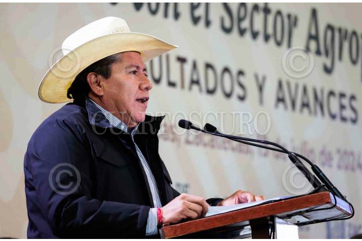 ZACATECAS ZACATECAS. 19JULIO2024.- Andrés Manuel López Obrador, presidente Constitucional de los Estados Unidos Mexicanos y Claudia Sheinbaum Pardo virtual presidenta electa de los Estados Unidos Mexicanos presiden Encuentro con el sector agropecuario en el Palacio de Convenciones de Zacatecas. Lo acompañan Carlos Gastón Torres Rosas, secretario técnico del Gabinete de la Presidencia y coordinador general de Programas para el Bienestar; Arturo Macosay Córdova, coordinador general de Ganadería de la Secretaria de Agricultura y Desarrollo Rural; Víctor Suárez Carrera, subsecretario de Autosuficiencia Alimentaria de la Secretaría de Agricultura y Desarrollo Rural, responsable del Programa “Producción para el Bienestar”; Víctor Manuel Villalobos Arámbula, secretario de Agricultura y Desarrollo Rural. Arely Cerón Trejo, coordinadora general del Programa de Fertilizantes para el Bienestar de la Secretaria de Agricultura y Desarrollo Rural; Santiago Arguello Campos, coordinador general de Agricultura de la Secretaria de Agricultura y Desarrollo Rural; David Monreal Ávila, Gobernador Constitucional del Estado de Zacatecas. FOTO: PRESIDENCIA/CUARTOSCURO.COM