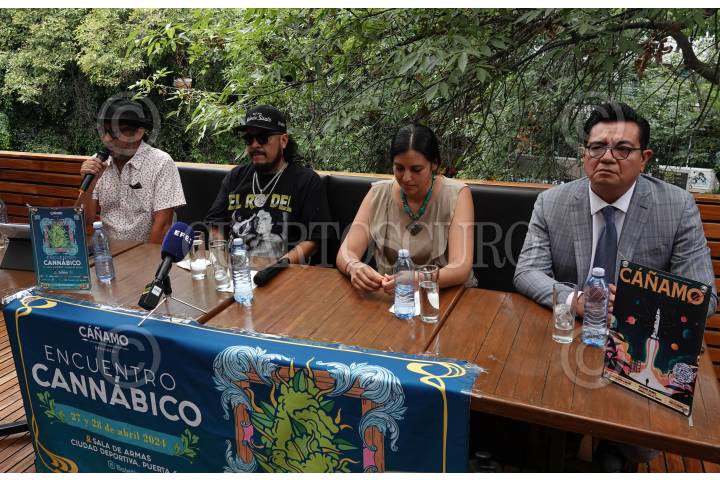 CIUDAD DE MÉXICO, 04ABRIL2024.- Julio Zenil, directo de la revista Cáñamo; el rapero Muelas de Gallo; Mildred Delgado, veterinaria zootecnista, y el abogado Manolo Castro participaron en la conferencia de prensa para anunciar el Encuentro Cannábico 2024. Espacio que busca reunir a especialistas y comunidad del mundo de la cannabis para concientizar sobre su consumo y demás aplicaciones que la planta tiene. FOTO: GALO CAÑAS/CUARTOSCURO.COM