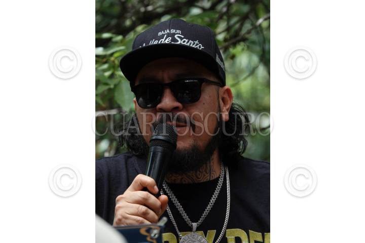 CIUDAD DE MÉXICO, 04ABRIL2024.- El rapero Muelas de Gallo durante la conferencia de prensa para anunciar el Encuentro Cannábico 2024. Espacio que busca reunir a especialistas y comunidad del mundo de la cannabis para concientizar sobre su consumo y demás aplicaciones que la planta tiene. FOTO: GALO CAÑAS/CUARTOSCURO.COM