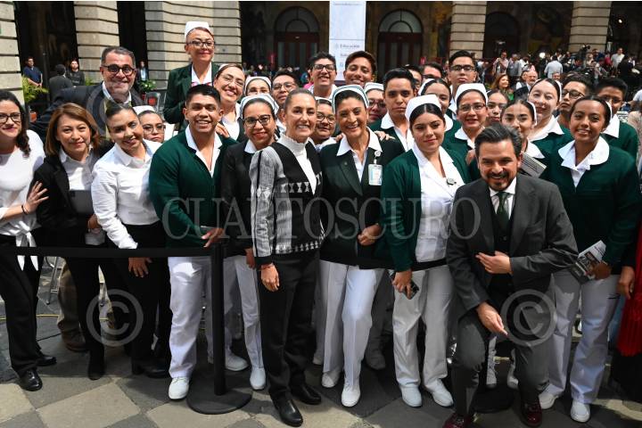 CIUDAD DE MÉXICO, 25FEBRERO2025.- Claudia Sheinbaum, Presidenta de México; Fabiana Maribel Zepeda Arias “Jefa Fabiana”, titular de la Coordinación de Enfermería del IMSS; Zoé Robledo, director del IMSS, y enfermeras del IMS, durante la presentación de la estrategia nacional: Vive saludable, vive feliz, la cual tiene como objetivo inculcar hábitos saludables a los niños y niñas de educación básica en la escuelas de la SEP. FOTO: PRESIDENCIA/CUARTOSCURO.COM