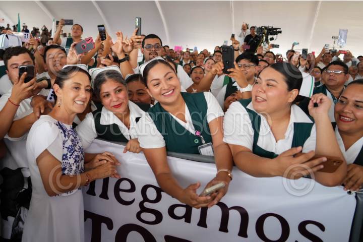 COATZACOALCOS, VERACRUZ, 06JUNIO2025.- Claudia Sheinbaum Pardo, Presidenta de México, acompañada de decenas de enfermeras, durante la inauguración Hospital Materno Infantil IMSS-Bienestar Coatzacoalcos. Al evento acudieron decenas de enfermeras del IMSS. FOTO: PRESIDENCIA/CUARTOSCURO.COM