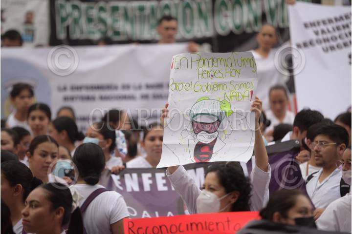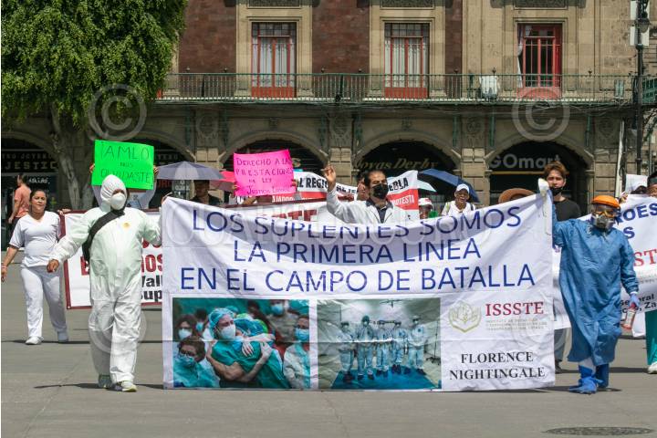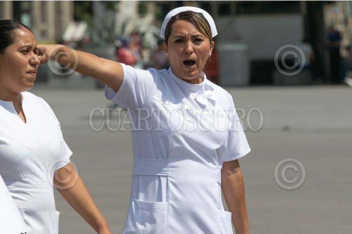 CIUDAD DE MÉXICO, 20MAYO2024.- Enfermeras y enfermeros suplentes del ISSSTE marcharon en el Zócalo para exigir la base laboral que las autoridades les habían prometido durante la pandemia, exigieron el Presidente de México que escuche sus demandas. FOTO: MOISÉS PABLO/CUARTOSCURO.COM