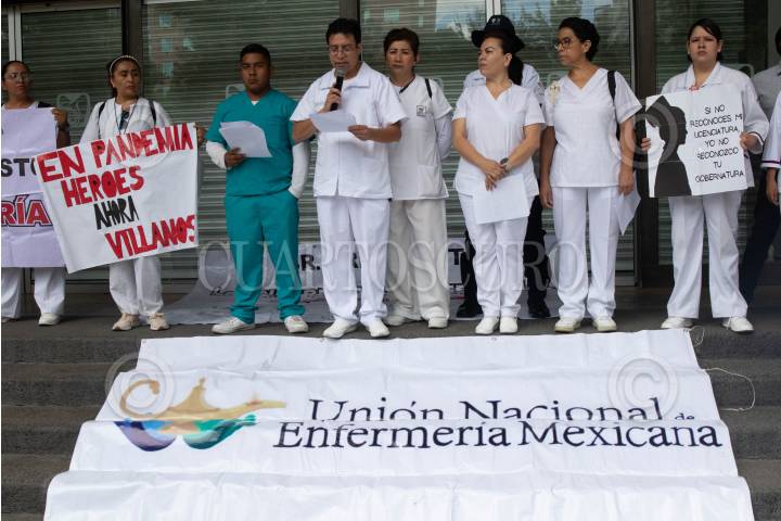 Integrantes de la Unión Nacional de Enfermería Mexicana se manifestaron frente a las oficinas del IMSS para exigir al gobierno federal salario justo, ya que señalan que durante la pandemia les prometieron aumentos de sueldos y plazas fijas.