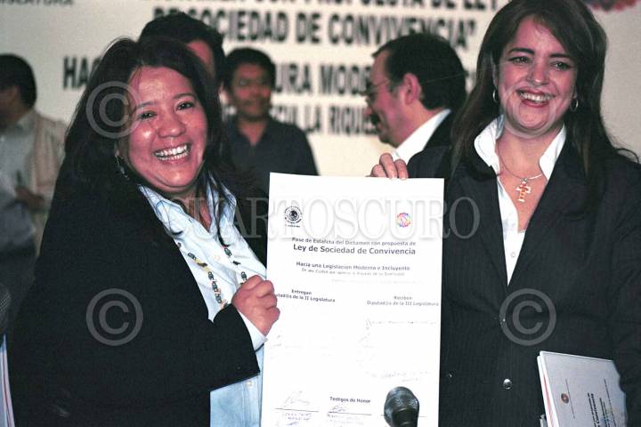 La diputada Enoe Uranga Muñoz y Lorena Villavicencio Ayala, firmaron el dictamén con propuesta de ley de sociedad de convivencia en la Asamblea Legislativa del DF. FOTO: Ricardo Hernández/CUARTOSCURO.COM