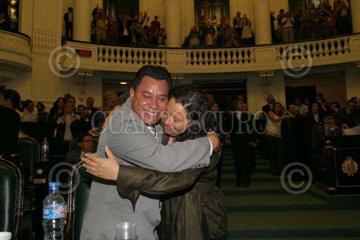 MEXICO, D.F.09NOVIEMBRE2006.- El asambleista Edgar Torres festeja con su compañera de partido Enoe Uranga la aprobación en lo general de la Ley de convivencia en la Asamblea Legislativa del D.F. FOTO: NELLY SALAS/CUARTOSCURO.COM