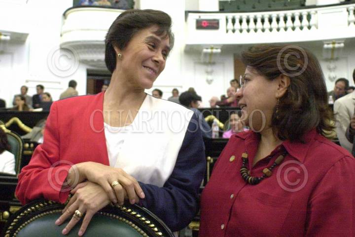 Maria de los Angeles Moreno y Enoé Uranga, platican durante la sesion en la ALDF. FOTO: Pedro Mera/CUARTOSCURO.COM