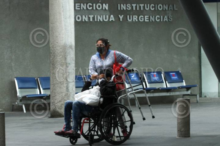 Madre traslada a su hijo en silla de ruedas por el área de urgencias del Hospital de Nutrición.