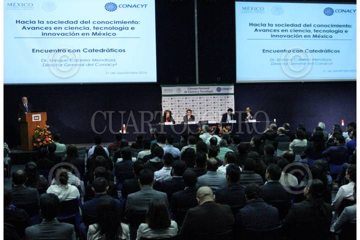 CIUDAD DE MÉXICO, 21SEPTIEMRBE2016.- Enrique Cabrero, director general del Conacyt, inauguró oficialmente el "Encuentro de Catedráticos Conacyt" en la Academia Mexicana de Ciencias, al sur de la ciudad. Compartió el presidium con Elías Micha, coordinador de Ciencia, Tecnología e Innovación de la Ofician de la Presidencia; Jaime Urrutia, presidente de la Academia Mexicana de Ciencias; y Julio Tagüeña, directora adjunta de Desarrollo Científico. FOTO: MARÍA JOSÉ MARTÍNEZ /CUARTOSCURO.COM