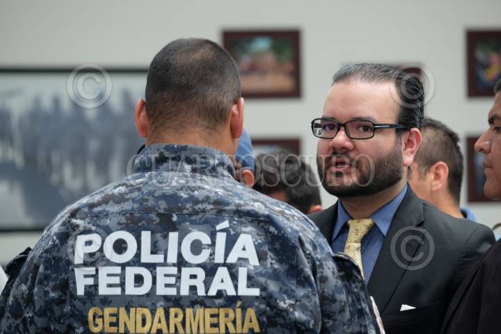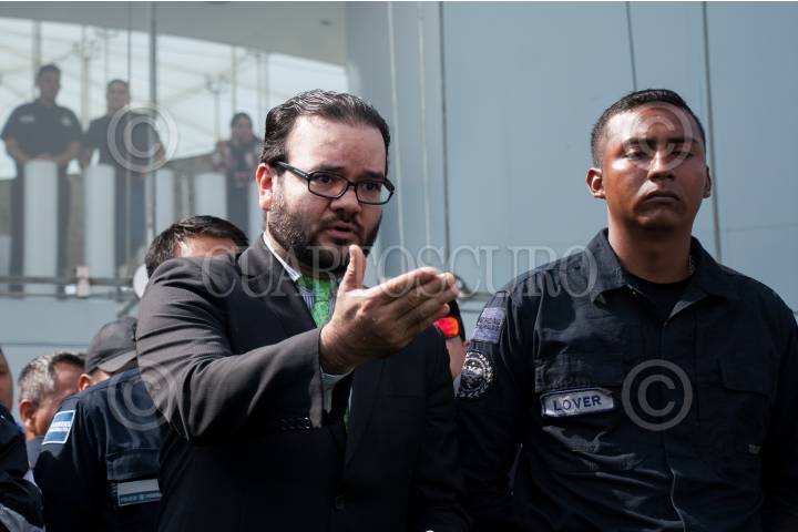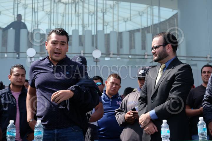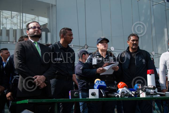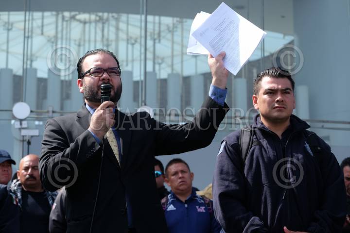 CIUDAD DE MÉXICO, 08JULIO2019.- Por sexto día, elementos de la Policía Federal (PF) continúan con las mesas de diálogo en el Centro de Mando, en las que protestan por sus derechos laborales para recibir indemnización y la negación de su integración a la Guardia Nacional. Pidieron a las autoridades recibir respuesta a la una de la tarde. En la imagen Enrique Carpizo, asesor y licenciado, y el policía Adrián López durante una conferencia que ofrecieron a los medios de comunicación. FOTO: GRACIELA LÓPEZ /CUARTOSCURO.COM