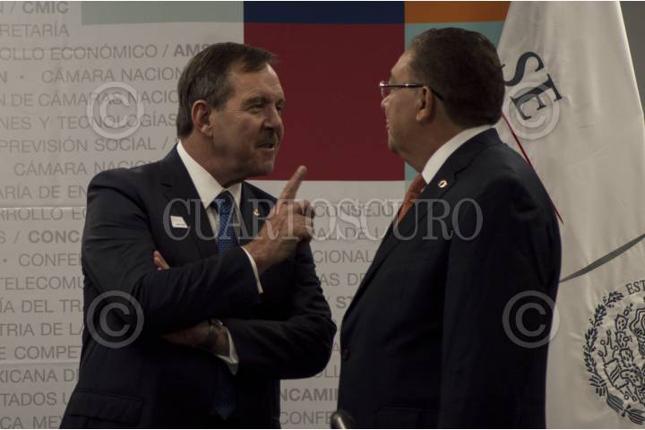 CIUDAD DE MÉXICO, 27JULIO2016.- Enrique Sola Sentíes, presidente de la CONCANACO-SERVITUR, conversó con Enrique Guillen Mondragón, presidente nacional de CANACINTRA, previó al inició de la conferencia de prensa para anunciar la convocatoria del Premio Nacional de Calidad 2016. FOTO: GALO CAÑAS /CUARTOSCURO.COM