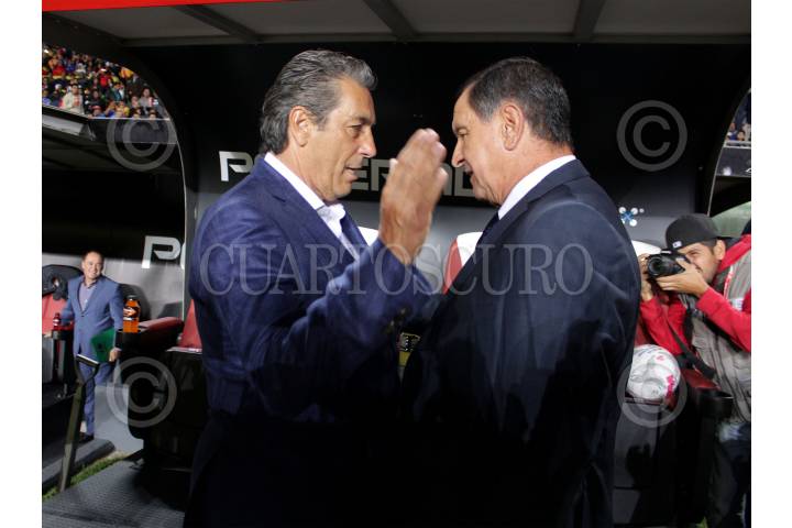 MORELIA, MICHOACÁN, 10ENERO2016.- Monarcas Morelia, empató 2-2 la noche del sábado ante Cruz Azul, en el Estadio Morelos. El equipo regresó al partido, después de que el equipo capitalino se adelantó en el marcador con la pena máxima, con gol del "Chaco" Giménez. Luis Gabriel Rey, jugador que se presentó cómo nuevo refuerzo, anotó el gol del empate que salvó el partido. En la imagen los técnicos Tomás Boy y Enrique Meza se saludan antes de iniciar el encuentro. FOTO: ALAN ORTEGA /CUARTOSCURO.COM