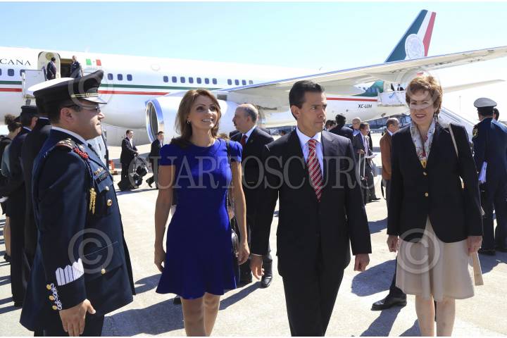 MADRID, ESPAÑA, 08JUNIO2014.- Enrique Peña Nieto, presidente de México, acompañado de su esposa, Angélica Rivera de Peña, arribó esta mañana al aeropuerto Adolfo Suárez Madrid-Barajas, procedente de la República Italiana. FOTO: CUARTOSCURO.COM