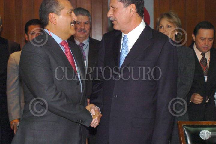 MÈXICO, D.F. 14JULIO2006.- En la sede del PRI nacional, se llevò a cabo la elecciòn del coordinador de este partido en el senado, Enrque Jackson felicitando a Mario Fabio Beltrones. FOTO: Fernando García/CUARTOSCURO.COM