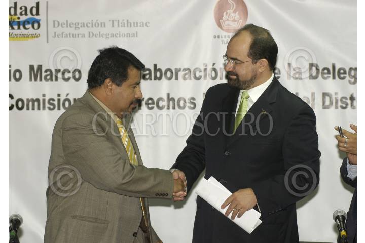 MÉXICO, D.F., 21AGOSTO2007.- Gilberto Ensastiga Santiago, jefe delegacional en Tlahuác y Emilio Alvarez Icaza, presidente de la CDHDF, firmaron el convenio sobre derechos humanos realizada en su la sede local del Comisión de Derechos Humanos del DF. FOTO: IVÁN MENDEZ/CUARTOSCURO.COM