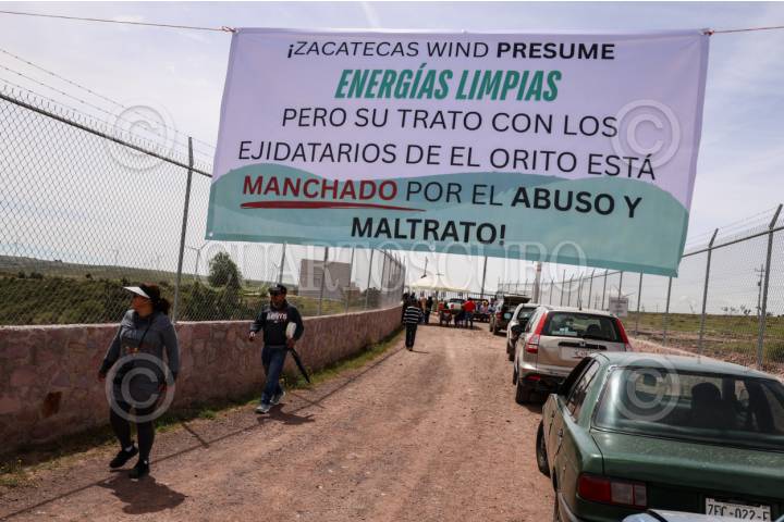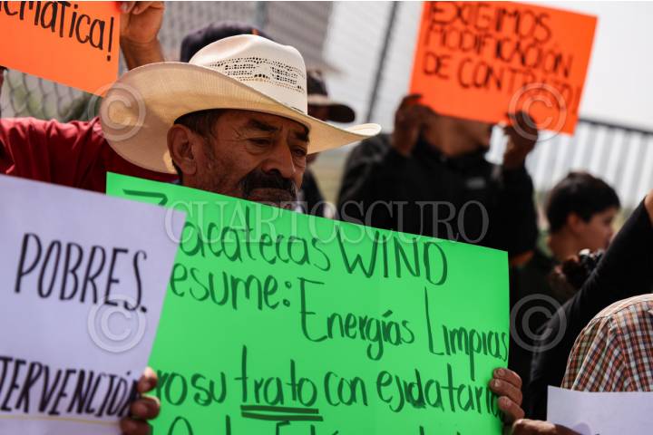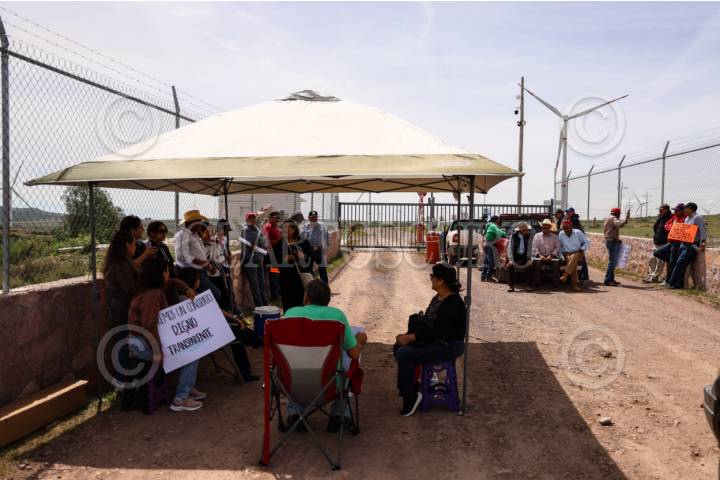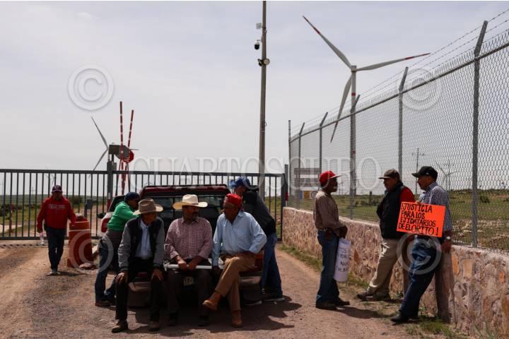 ZACATECAS, ZACATECAS, 08AGOSTO2025.- Ejidatarios de la comunidad de El Orito realizaron una manifestación y plantón frente a las instalaciones de la empresa eólica Zacatecas Wind. Señalaron que sus predios, que abarcan alrededor de 660 hectáreas afectadas por caminos y aerogeneradores, están incluidos en un contrato de arrendamiento que, según dijeron, fue modificado por la empresa, dejando sin beneficio a la mayoría. Indicaron que, aunque fueron citados días atrás por la Procuraduría Agraria para dialogar, la empresa no acudió. FOTO: ADOLFO VLADIMIR /CUARTOSCURO.COM