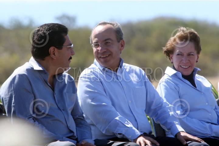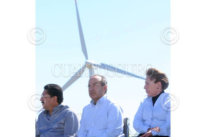JUCHITAN DE ZARAGOZA, OAXACA, 22ENERO2009.- Ulises Ruiz, gobernador del estado, Felipe Calderón Hinojosa, presidente de México, y Georgina Kessel, secretaría de Energía, encabezaron la inauguración de la Central de Energía Parques Ecológicos de México, que se llevó a cabo en las instalaciones del Proyecto Parques Ecológicos de México, ejido la Ventosa. FOTO: ALFREDO GUERRERO/CUARTOSCURO.COM