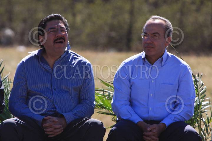 JUCHITAN DE ZARAGOZA, OAXACA, 22ENERO2009.- Ulises Ruiz, gobernador del estado, y Felipe Calderón Hinojosa, presidente de México, encabezaron la inauguración de la Central de Energía Parques Ecológicos de México, que se llevó a cabo en las instalaciones del Proyecto Parques Ecológicos de México, ejido la Ventosa. FOTO: MAX NUÑEZ/CUARTOSCURO.COM