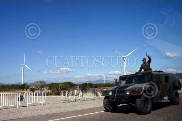 JUCHITAN, OAXACA, 22ENERO2009.- En medio de un fuerte operativo de seguridad fue inaugurado la Central de Energía Parques Ecológicos de México, que se llevó a cabo en las instalaciones del Proyecto Parques Ecológicos de México, ejido la Ventosa en el Istmo de Tehuantepec, con una infraestructura que supera los diez millones de pesos. FOTO: MAX NÚÑEZ/CUARTOSCURO.COM