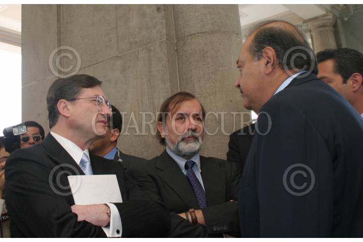 MEXICO, D.F, 29SEPTIEMBRE2005.- José Gutierrez Vivo, director del grupo Monitor, Epigmenio Ibarra, productor de televisión y Carlos Slim Helú, empresario, durante la firma el Acuerdo Nacional para la Unidad, el Estado de Derechos, el Desarrollo, la Inversión y el Empleo, en el Alcazar del Castillo de Chapultépec. FOTO: Moisés Pablo/CUARTOSCURO.COM