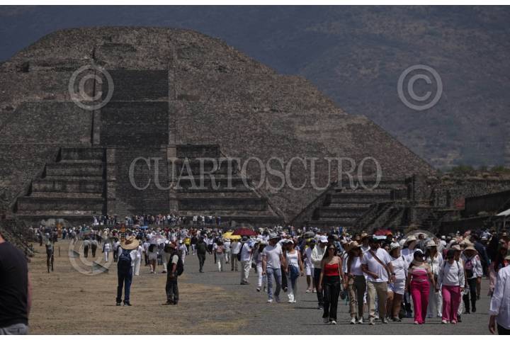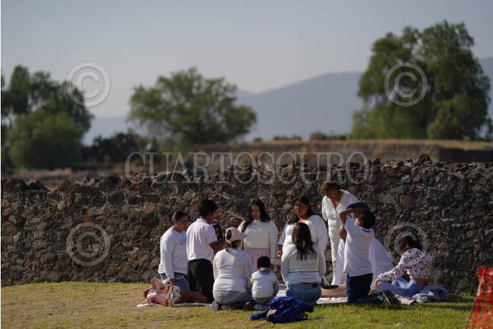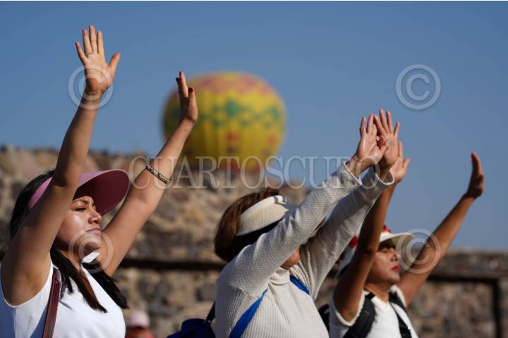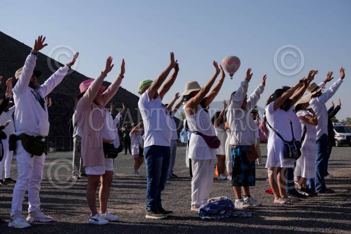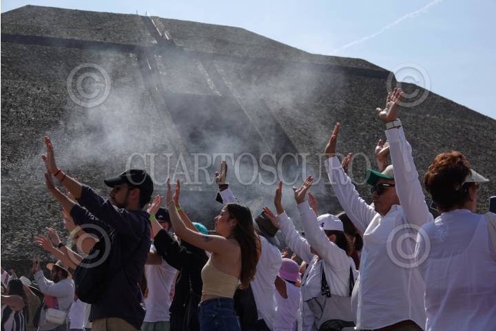 TEOTIHUACÁN, ESTADO DE MÉXICO, 21MARZO2025.- Miles de personas acudieron a la zona arqueológica de Teotihuacán para celebrar el inicio de la Primavera. Portando vestimenta blanca o con colores claros las y los asistentes alzaron sus manos hacia el sol para "cargarse de energía" y agradecer el cambio de estación.  FOTO: GALO CAÑAS/CUARTOSCURO.COM