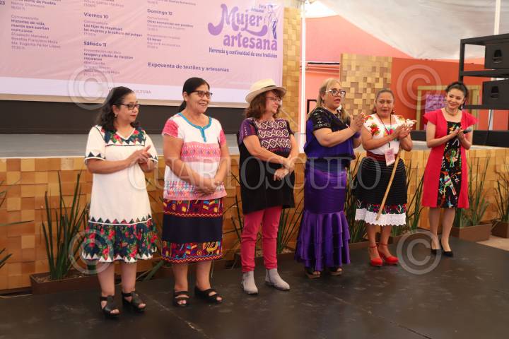 Amparo de Jesús Rincón Pérez Coordinación de Arte Popular; Carmen Vázquez Hernández, Premio Nacional de Arte y Literatura 2019; Emma Yanes Rizo, directora del Fonart; Feliciana Nabor González y la jefa de la Unidad de Asuntos Jurídicos de la Secretaría de Cultura federal, Eréndira Cruzvillegas Fuentes durante la inauguración de la Feria Artesanal “Mujer artesana” en el Museo Nacional de Culturas Populares.