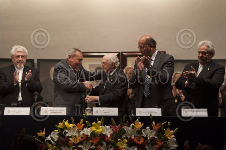 MÉXICO, D.F., 24AGOSTO2012.- El poeta chiapanaeco, Eraclio Zepeda ingreso en sesión solemne a la Academia Mexicana de la Lengua por su destacado trabajo en las lenguas indigenas. Lo acompañaron los maestros Fernando Quirarte, el escritor Jaime Labastida y el maestro Felipe Garrdio, esto anoche en la Sala Manuel M. Ponce del Palacio de Bellas Artes. FOTO: FRANCISCO RODRÍGUEZ /CUARTOSCURO.COM