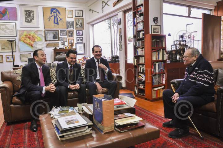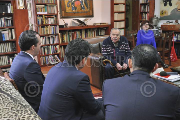 MÉXICO, D.F., 09DICIEMBRE2014.- Senadores integrantes de la Comisión de la Medalla Belisario Domínguez, Zoé Robledo, Roberto Gil Zuarth y Roberto Armando Albores; acudieron al domicilio del escritor chiapaneco, Eraclio Zepeda, para notificarle que será reconocido con este galardón en Sesión Solemne del Senado. FOTO: CUARTOSCURO.COM