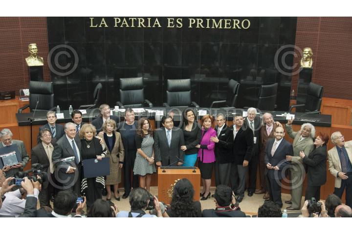 MÉXICO, D.F., 18NOVIEMBRE2014.- Eric Del Castillo, Benito Raúl Ibarra, Héctor Bonilla, Rogelio Guerra, Silvia Pinal, Amparo Garrido, Xavier López "Chabelo", Jacqueline Andere, José José, Manuel 'Loco' Valdés, Édgar Vivar, Pepe Bustos y Los Hermanos Carrión, acompañados de los senadores perredistas Zoé Robledo, Miguel Barbosa Huerta, la priísta Blanca Alcalá y la panista Mariana Gómez del Campo, se toman la foto después de los reconocimientos que otorgó el Senado de la República a dichos actores cuyo trabajo difunde la imagen y la cultura mexicana a nivel internacional. FOTO: DIEGO SIMÓN SÁNCHEZ /CUARTOSCURO.COM