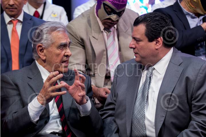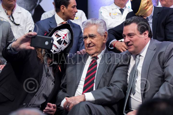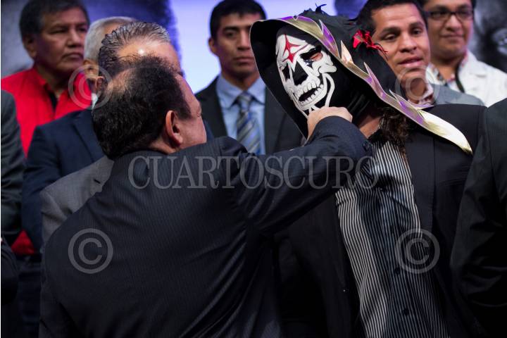 CIUDAD DE MÉXICO, 08FEBRERO2017.- El luchador profesional “La Parca”, el actor Eric del Castillo y Mauricio Sulaimán, presidente del Consejo Mundial de Boxeo (CMB), durante la presentación de la iniciativa “Unos segundos hacen la diferencia”, iniciativa propuesta por la Secretaria de Salud de la Ciudad de México para prevenir y atender de manera oportuna el cáncer de próstata. FOTO: GALO CAÑAS /CUARTOSCURO.COM