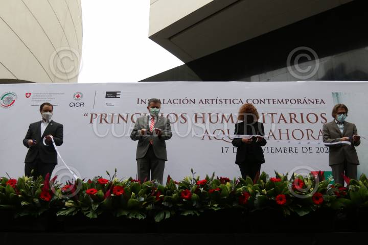Eric Mayoraz, embajador de Suiza en México; José Antonio Monroy, director general de Cruz Roja en México; Aliza Chelminsky, coordinadora general del Centro de Estudios Internacionales Gilberto Bosques (CEIGB) del Senado, y Jordi Raich, jefe de delegación para México y América Central del CICR, durante la de la exposición “Principios Humanitarios aquí y ahora”, en el Senado de la República.