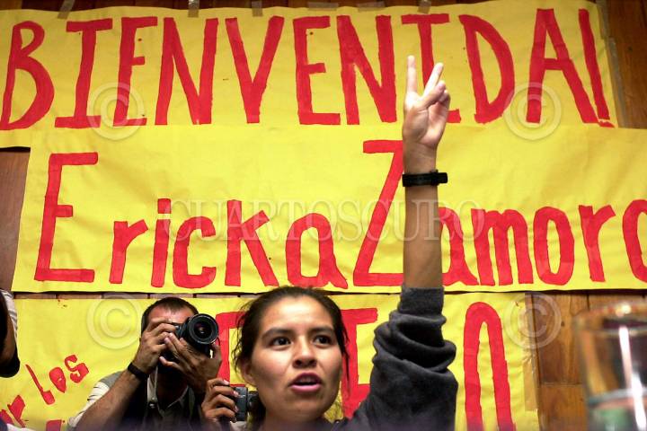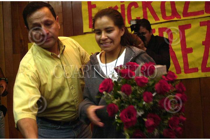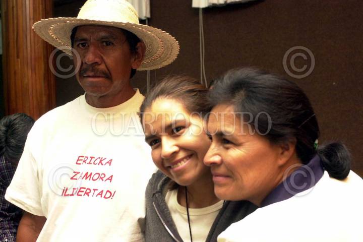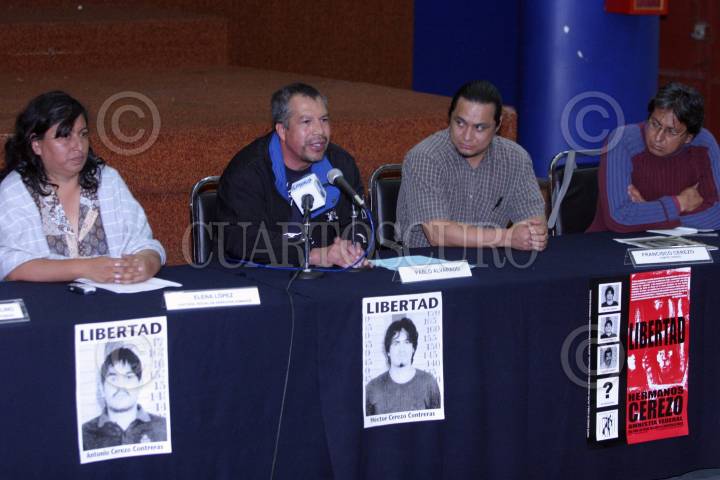 MEXICO, D.F., 25AGOSTO2006.- El indígena nahuatl Pablo Alvaro, fue liberado del CEFERESO 1 Altiplano antes La Palma tras 5 años de ser detenido injustamente por autoridades federales, ofreció una conferencia de prensa en el Centro Agustín Pro. Lo acompañaron Ericka Zamora y Francisco Cerezo, del Comité Cerezo México. FOTO: Moisés Pablo/CUARTOSCURO.COM
