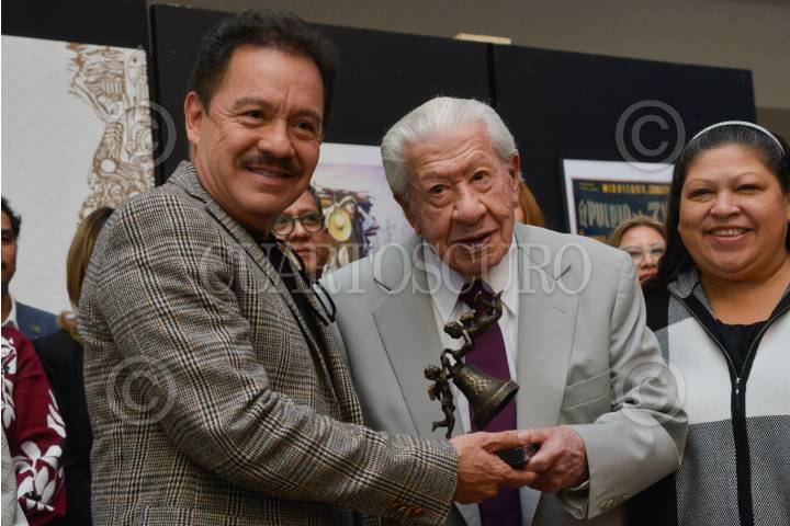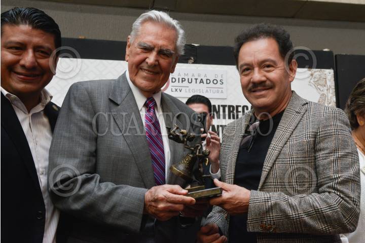 El primer actor Ignacio López Tarso, recibe de manos de Ignacio Mier, diputado y coordinador de Morena, el reconocimiento a su trayectoria artística en la Cámara de Diputados.