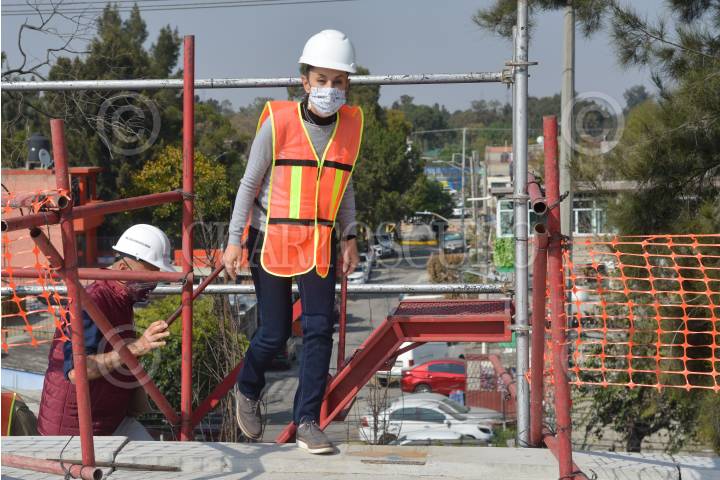 Trabajadores de construcción maniobraron las grúas y cavaron pozos para fijar las viguetas del puente peatonal que cruzará por calzada Ermita Iztapalapa