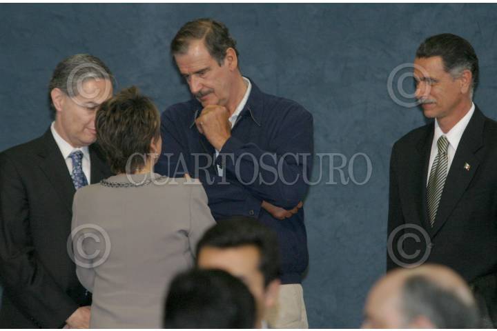 MEXICO, D.F. 29MARZO2006.- Luis Ernerto Derbez, secratario de Relaciones Exteriores, el presidente Vicente Fox, la senadora Silvia Hernández y Carlos Abascal, secretario de Gobernación al termino de la VII Reunión del Consejo Consultivo del Instituto de los Mexicanos en el Exterior. FOTO: Nelly Salas/CUARTOSCURO.COM