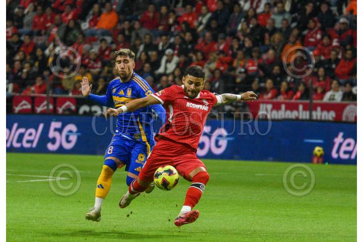 TOLUCA, ESTADO DE MÉXICO, 01FEBRERO2025.- Ernesto Vega delantero de los Diablos de Toluca y Fernando Gorriarán medio de Tigres de UANL, en el partido correspondiente a la jornada 5 del Torneo Clausura 2025 de la Liga MX, teniendo un marcador final 1-0.FOTO: CRISANTA ESPINOSA AGUILAR /CUARTOSCURO.COM