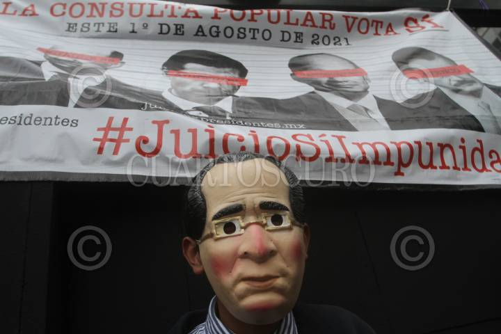 Un grupo de personas se protestaron con máscara de los ex presidentes de México para invitar a la ciudadanía a participar en la consulta popular que se llevará a cabo mañana 1 de agosto