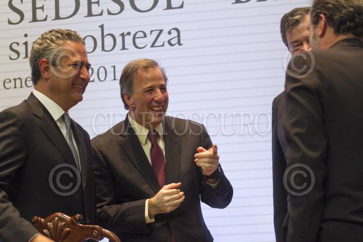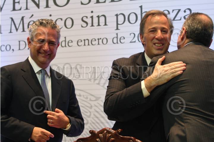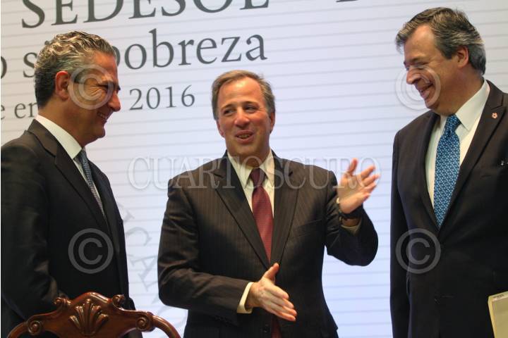 MÉXICO, D.F., 20ENERO2016.- Ernesto Torre Cantú, director del grupo financiero Banamex,José Antonio Meade, secretario de Desarrollo Social, y Andres Albo Márquez, director general de Fomento Social Banamex, firmaron un convenio de colaboración en la cual la institución financiera aportará 60 millones de pesos en proyectos conjuntos. FOTO: MOISÉS PABLO /CUARTOSCURO.COM