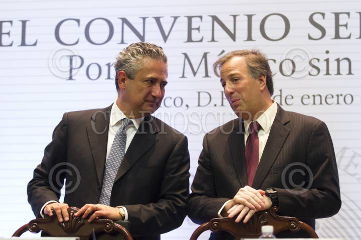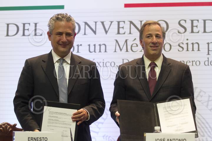 MÉXICO, D.F., 20ENERO2016.- Ernesto Torre Cantú, director del grupo financiero Banamex, y José Antonio Meade, secretario de Desarrollo Social, firmaron un convenio de colaboración en la cual la institución financiera aportará 60 millones de pesos en proyectos conjuntos. FOTO: MOISÉS PABLO /CUARTOSCURO.COM
