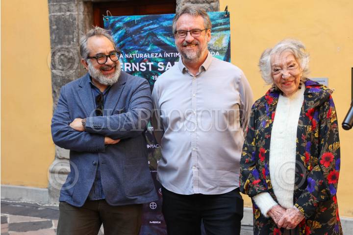 CIUDAD DE MÉXICO, 11DICIEMBRE2024.- Eugenio Caballero, diseñador de producción y ganador del premio Oscar; Canek Saemisch, y Gertrudis Zenses, viuda de Saemisch y fundadora de la asociación Ernst Saemisch A.C., durante la inauguración de la obra del alemán Ernst Saemisch "La naturaleza íntima de la vida", que estará a partir del 15 de diciembre hasta el 18 de mayo de 2025 en el Colegio de San Ildefonso. FOTO: MOISÉS PABLO/CUARTOSCURO.COM