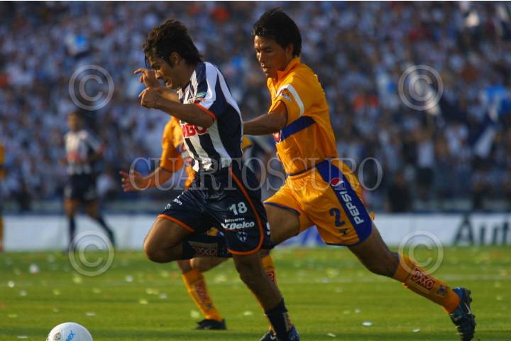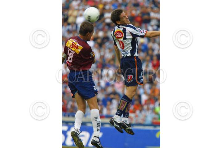 Monterrey, N.L. 10 de Abril de 2004.- Walter Erviti, jugador de Monterrey y Mario Ruiz jugador de Tigres, disputan el balón, durante el clásico regiomontano, realizado en el estadio Tecnológico de esta ciudad. FOTO: Jorge López/CUARTOSCURO.COM