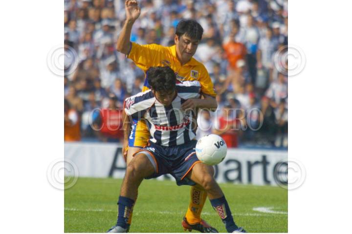 Monterrey, N.L. 10 de Abril de 2004.- Walter Erviti, jugador de Monterrey y Claudio Suarez jugador de Tigres, disputan el balon, durante el clásico regiomontano realizado en el estadio Tecnológico de esta ciudad. FOTO: Jorge López/CUARTOSCURO.COM