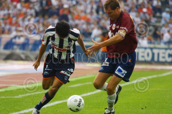 Monterrey, Nuevo León 27 Marzo 2004.- Guillermo Franco jugador del Monterrey y Dario Franco del Monarcas Morelia, se disputan el balón, durante el juego de la jornada 12. FOTO: Jorge López/CUARTOSCURO.COM